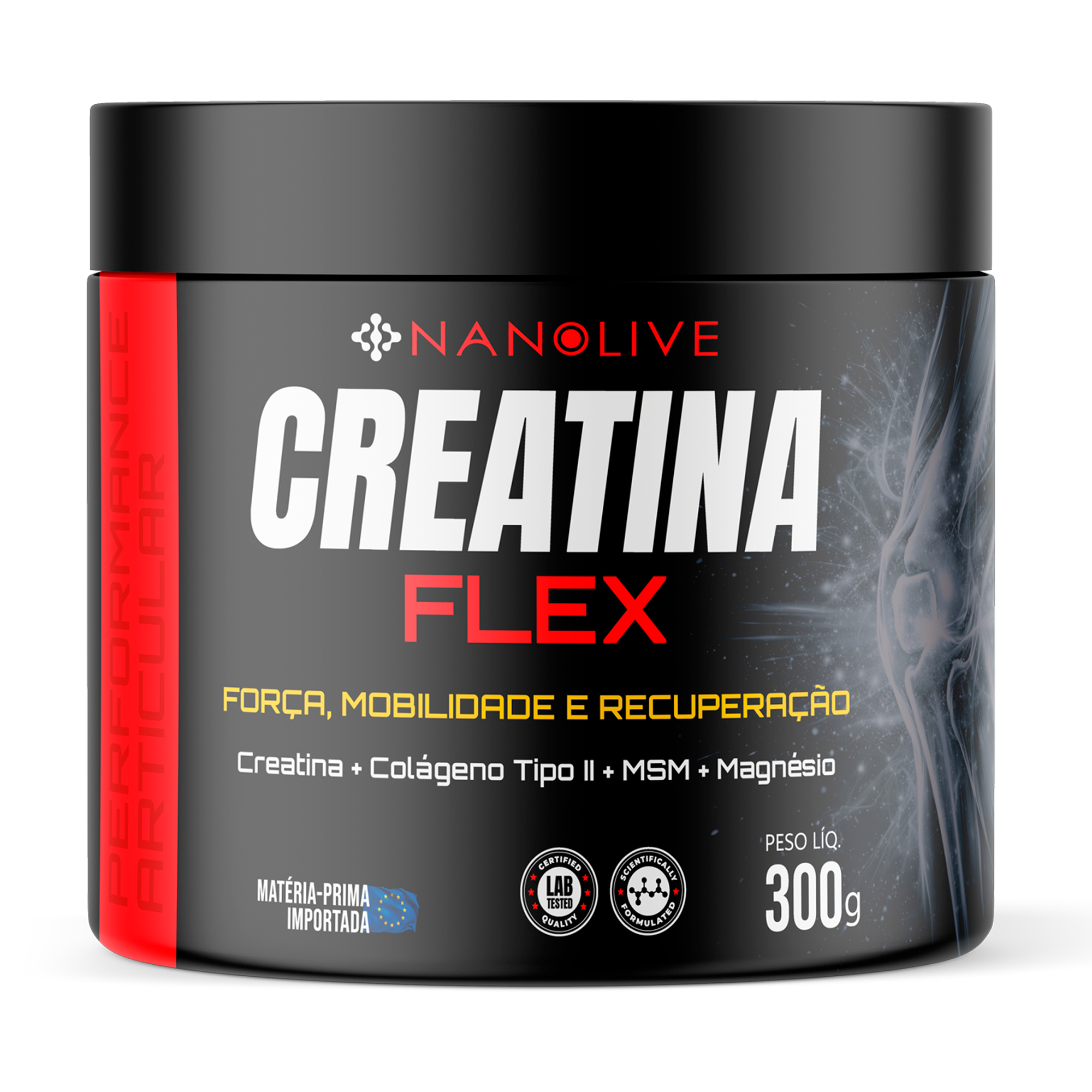 Sua fórmula combina Creatina, Colágeno Tipo II, MSM e Magnésio, atuando na regeneração articular, suporte muscular e redução do desconforto.
